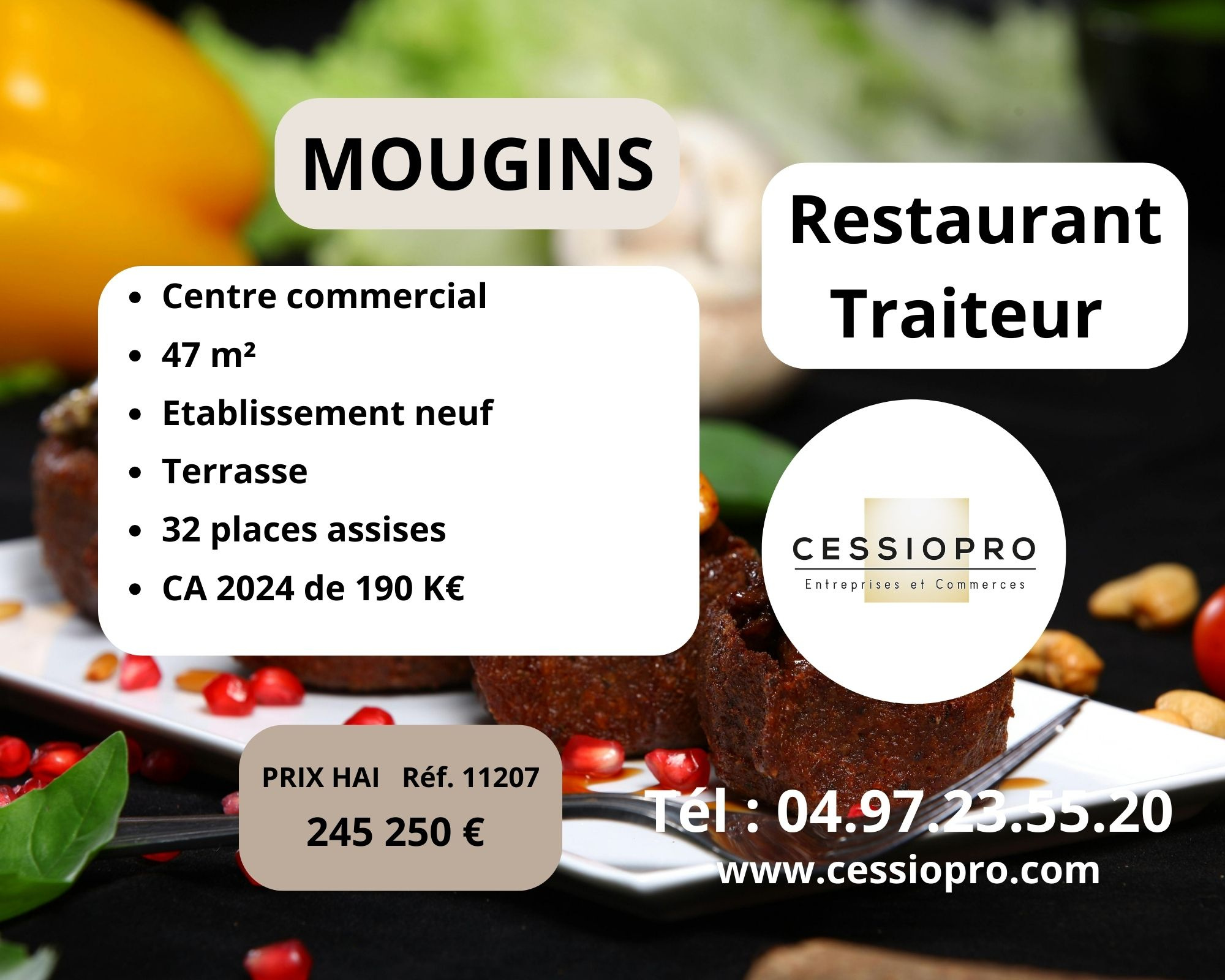 Mougins, centre commercial, restaurant – traiteur, établissement neuf avec terrasse.