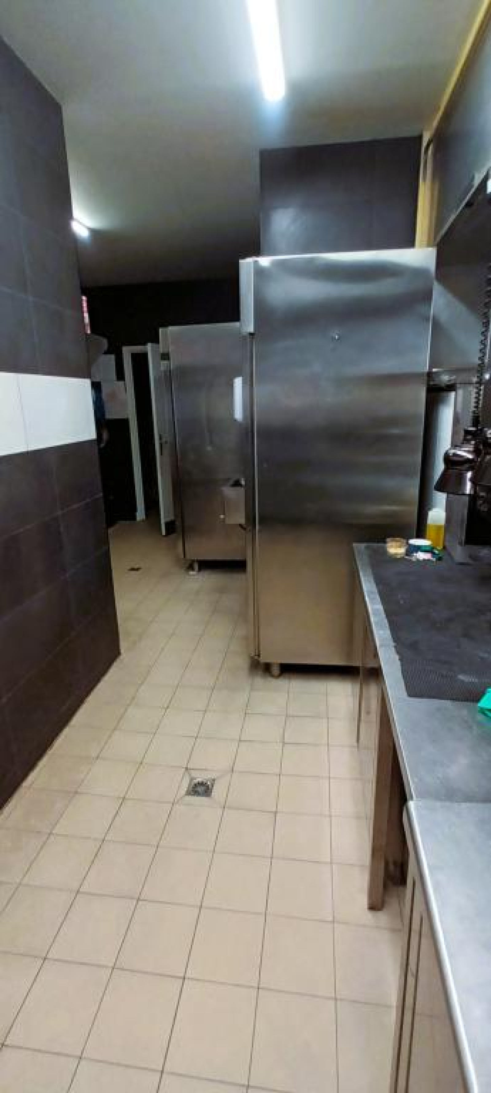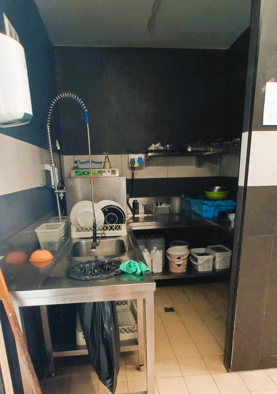 Elle est équipée d’une hotte, d’un piano central, 6 feux avec gaz de ville, plancha, four, meubles réfrigérés en positif et négatif et une plonge a part avec un lave-vaisselle et des étagères murales en inox.