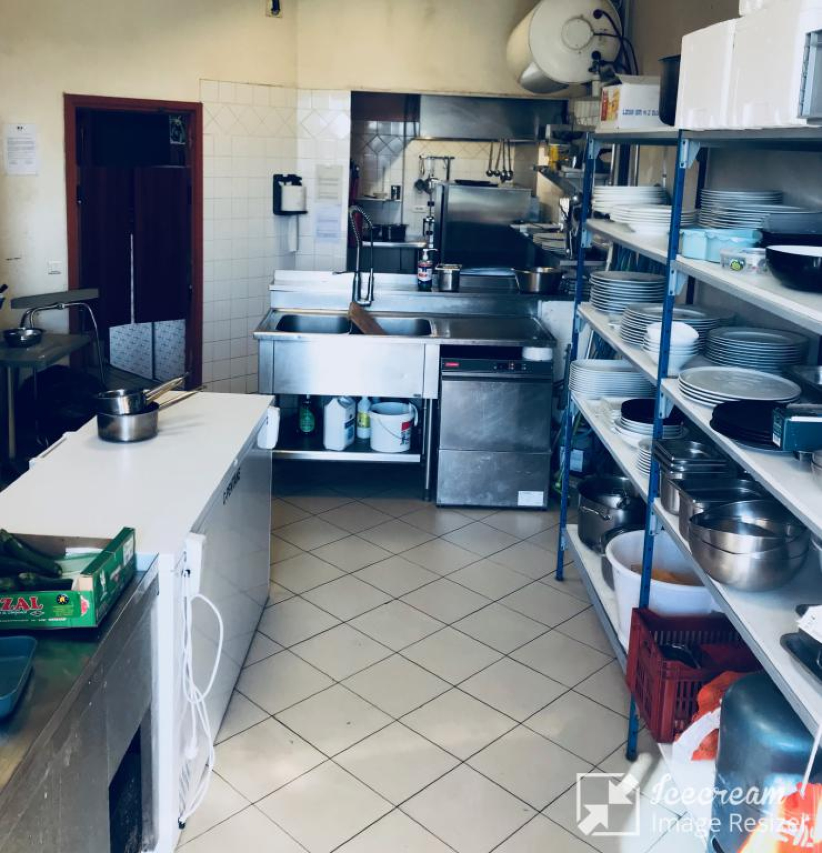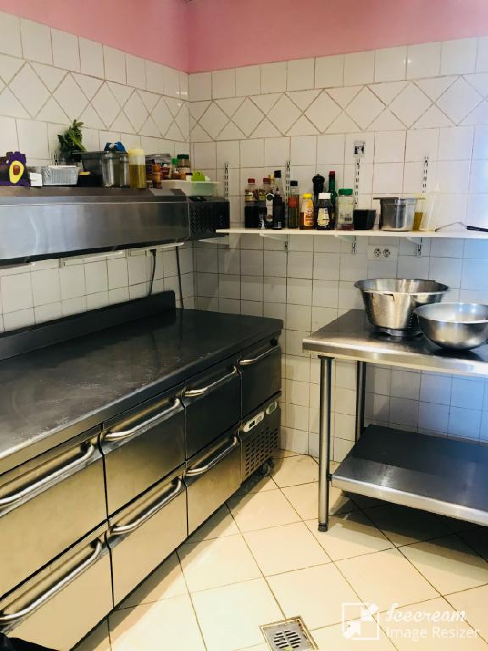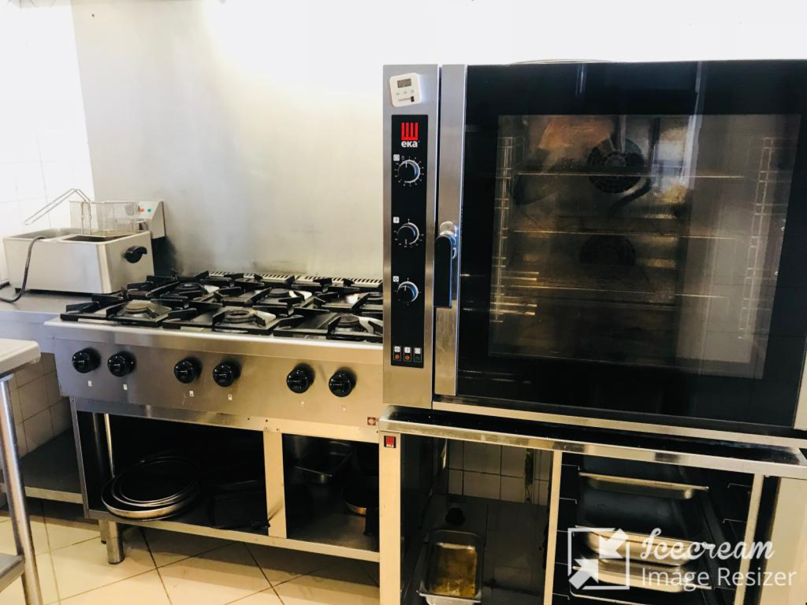La cuisine, dans les normes, spacieuse, complètement équipée, fourneau 4 feux, four EKA, friteuse, meuble réfrigéré 8 tiroirs, plonge séparée, permet de travailler dans de bonnes conditions et de partager l'espace avec ses collaborateurs aisément.