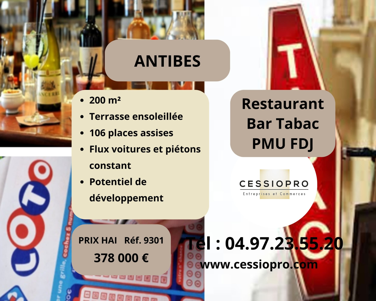 A vendre un restaurant, bar, tabac, PMU, FDJ, en dehors du centre-ville d’Antibes, terrasses ensoleillées, à développer.