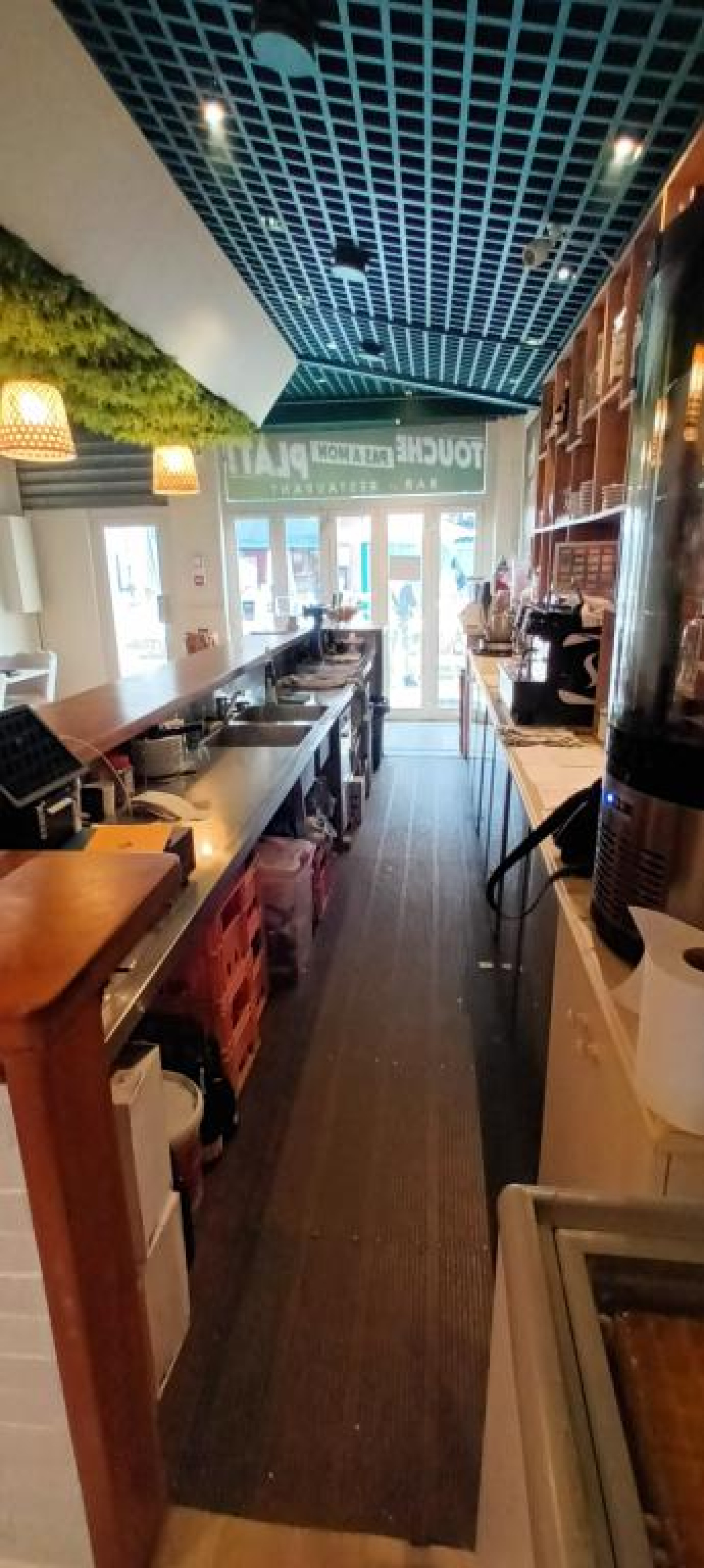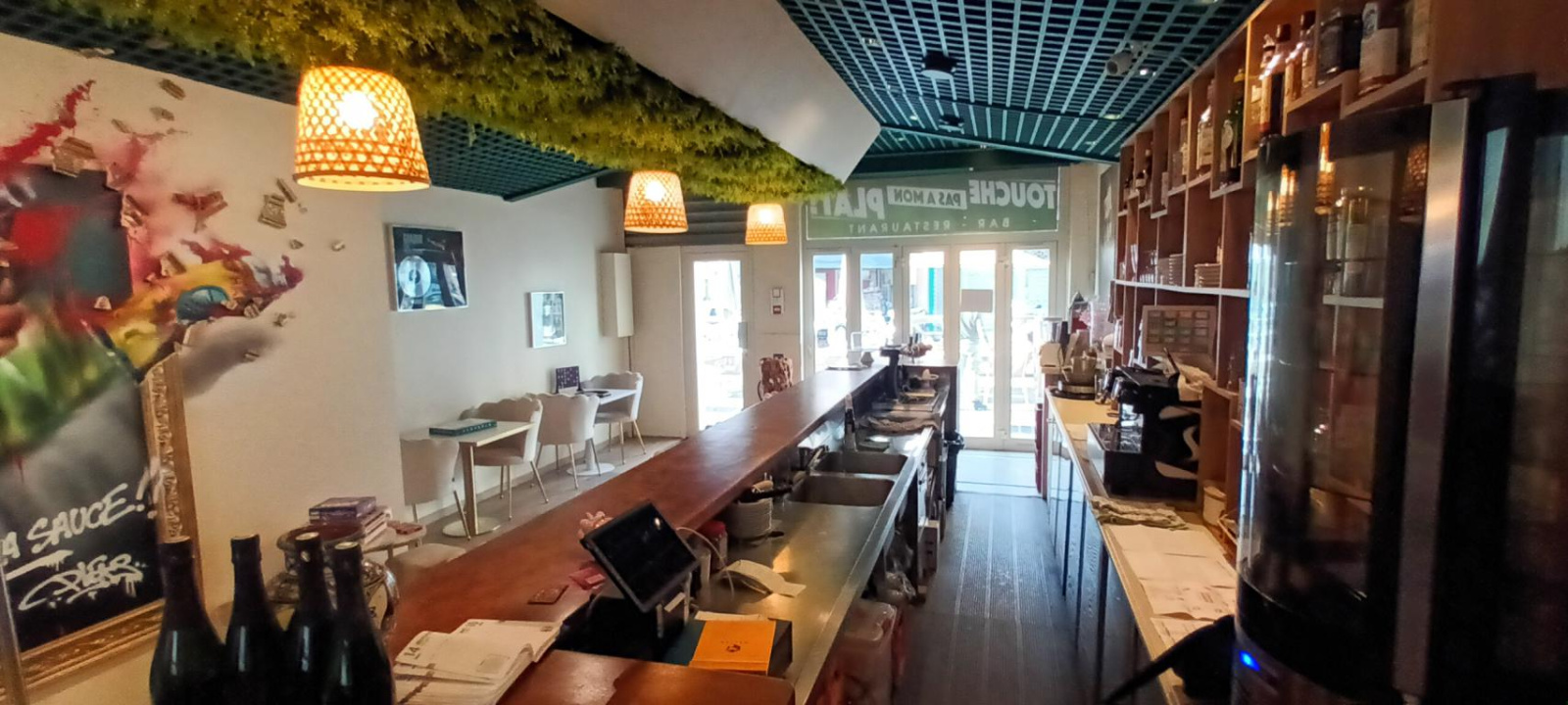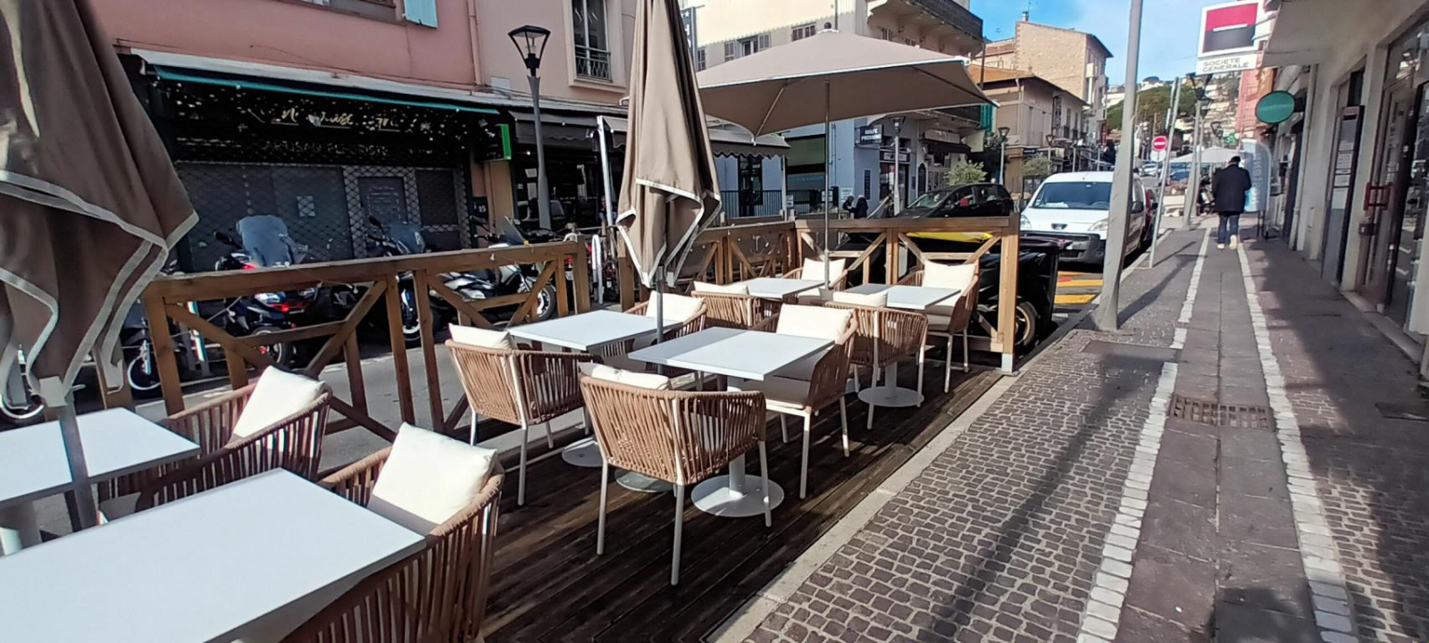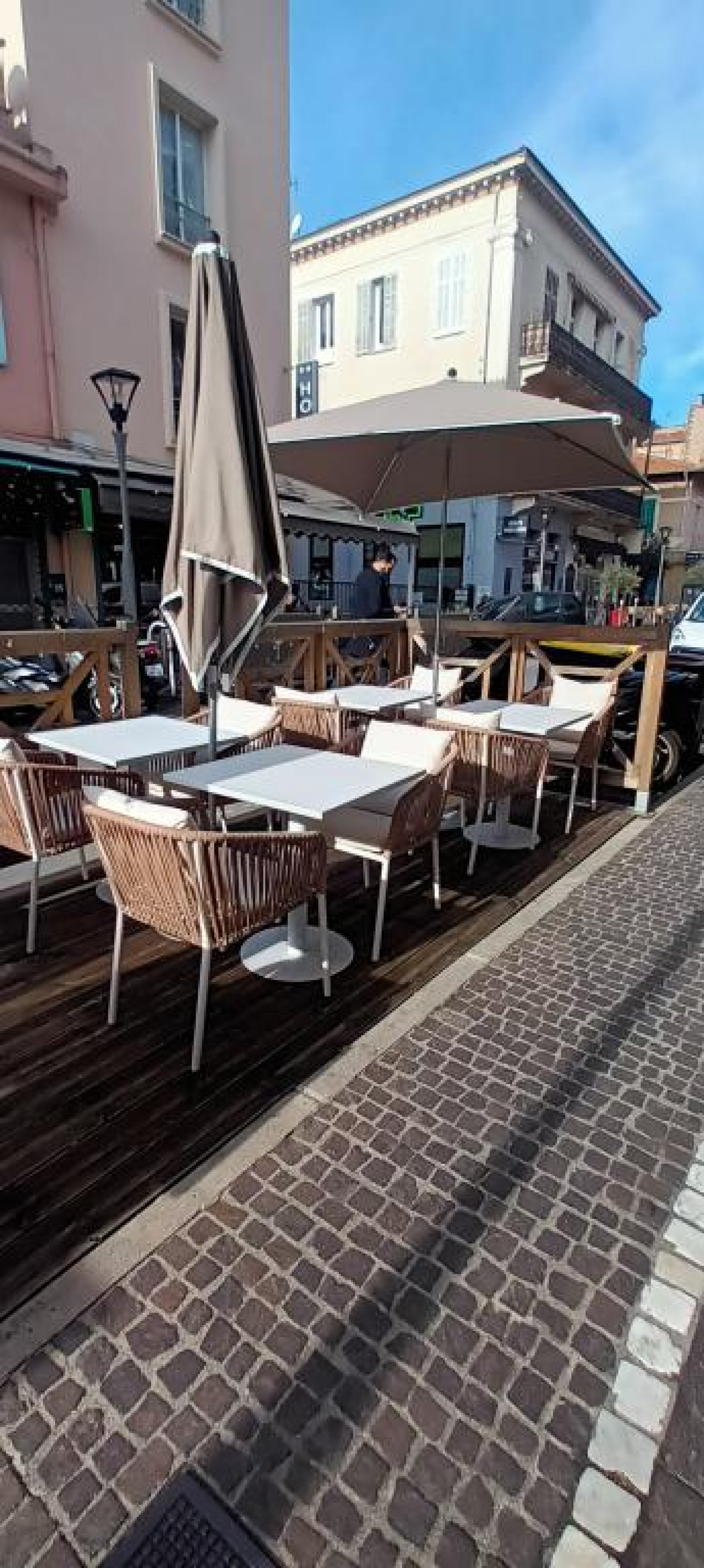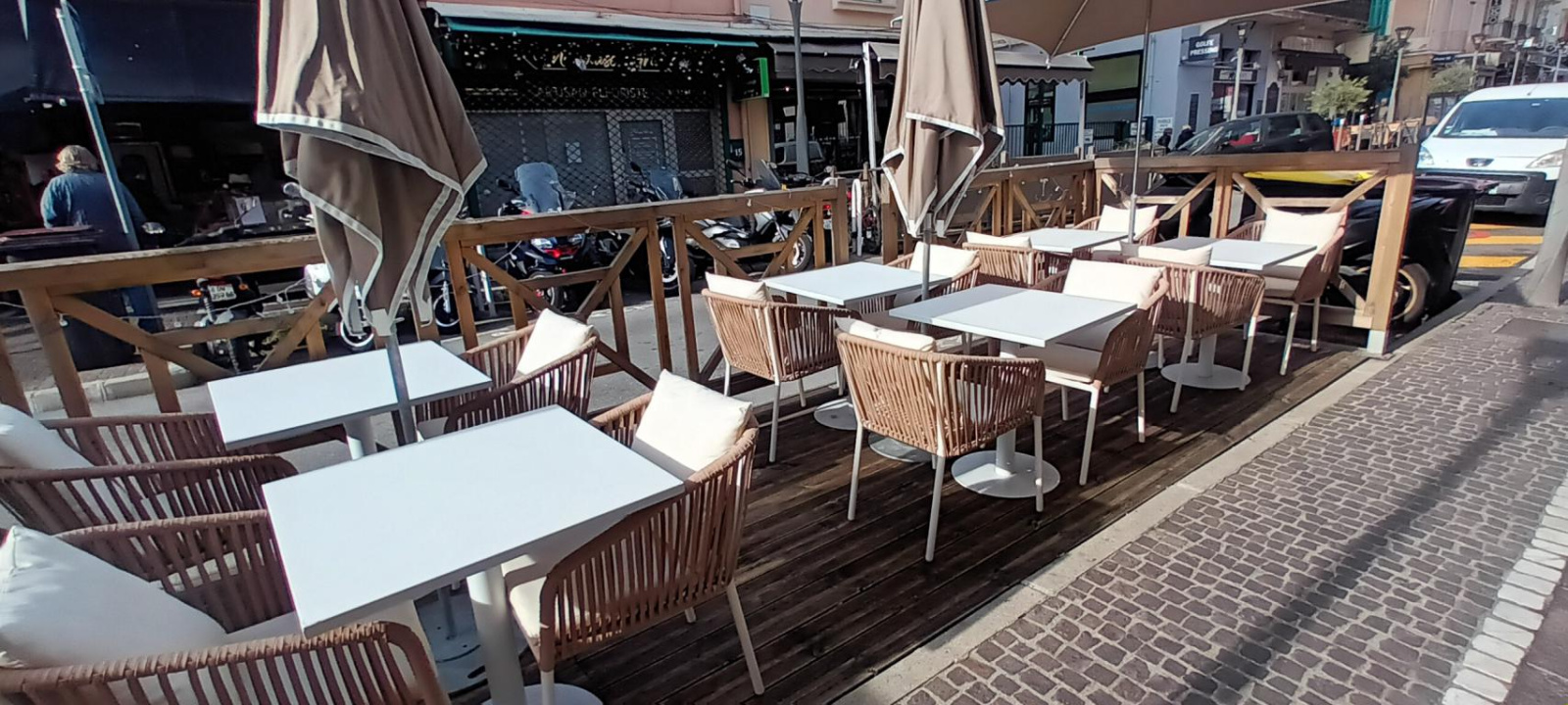 Une terrasse en bois, ensoleillée, d'une cinquantaine de places, longe la devanture du commerce, largement ouverte par de grandes baies vitrées.
