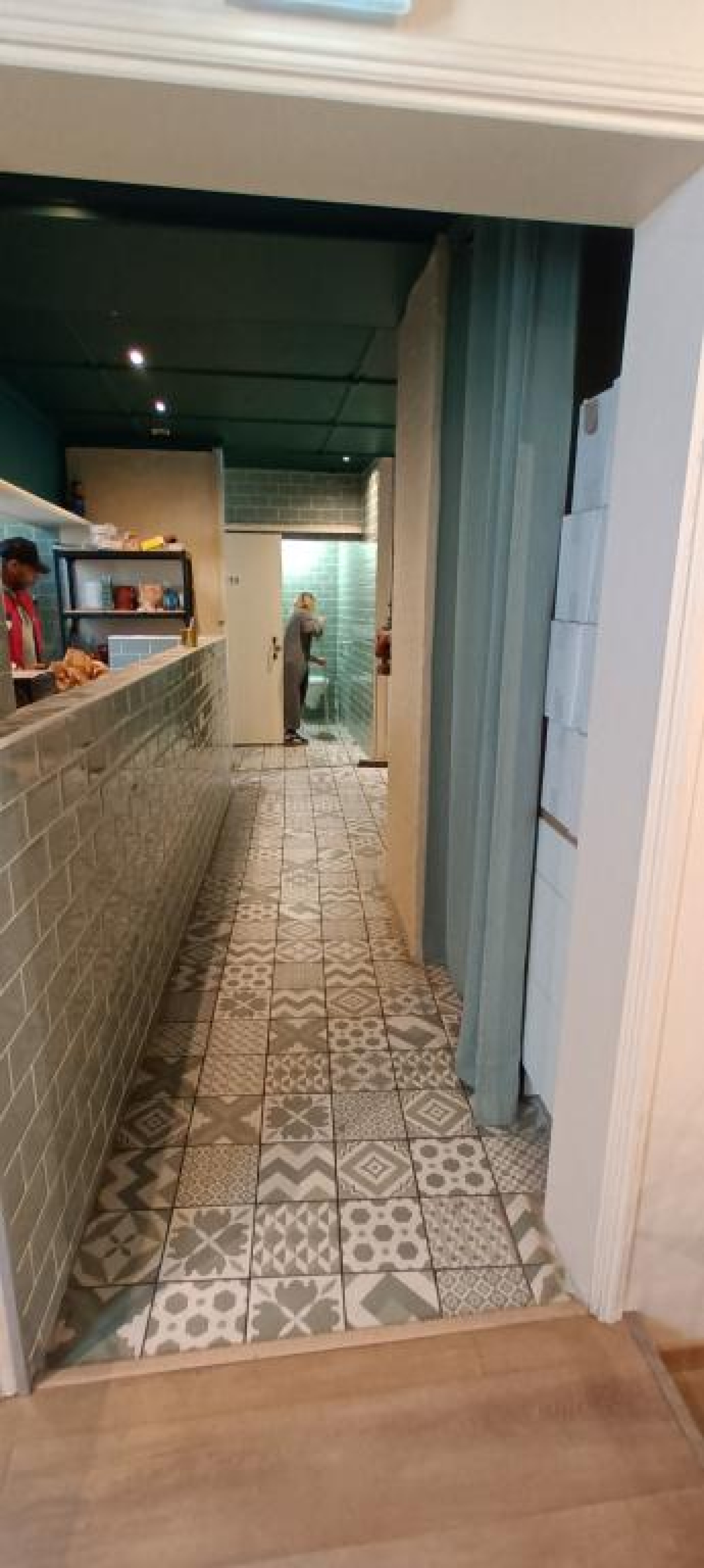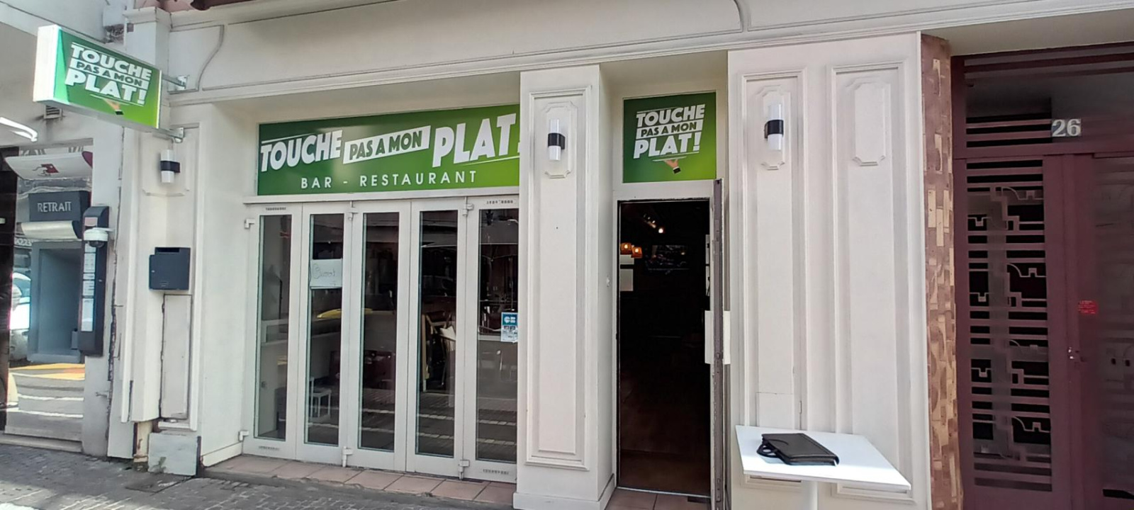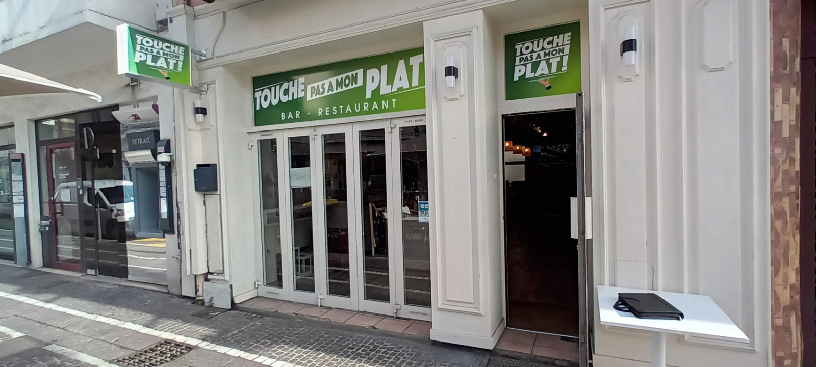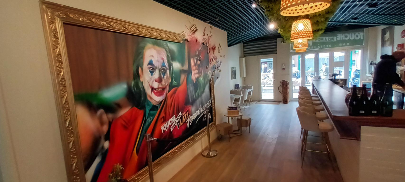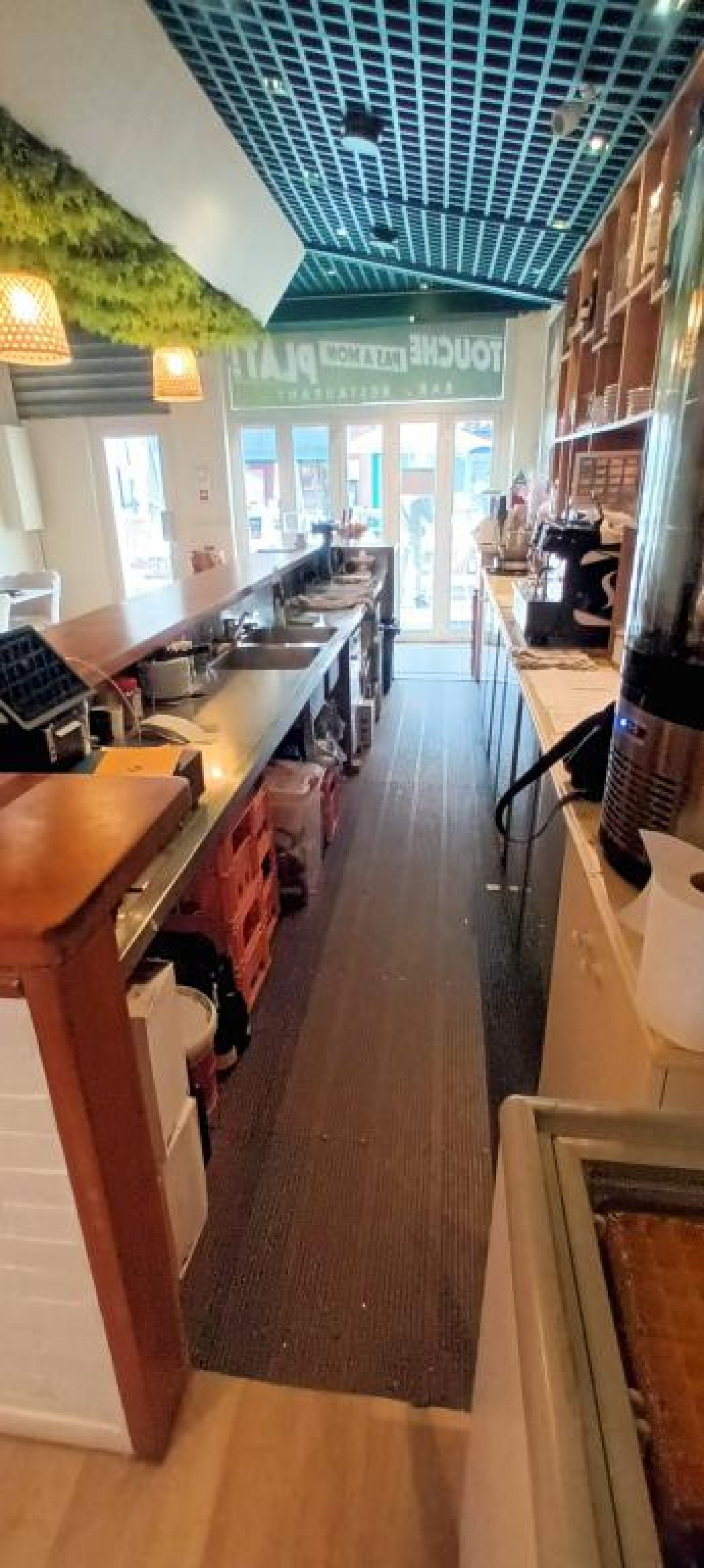Une terrasse en bois, ensoleillée, d'une cinquantaine de places, longe la devanture du commerce, largement ouverte par de grandes baies vitrées.