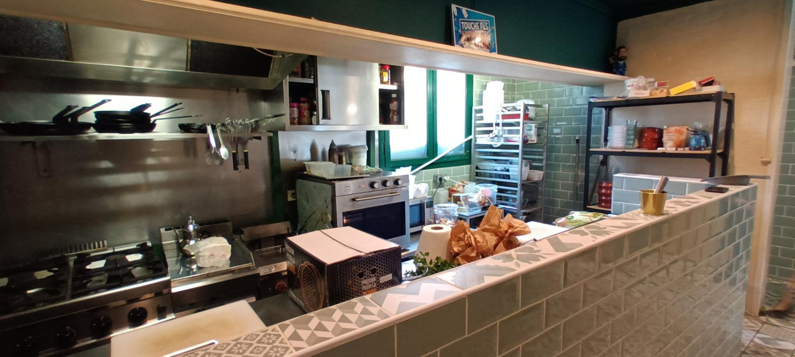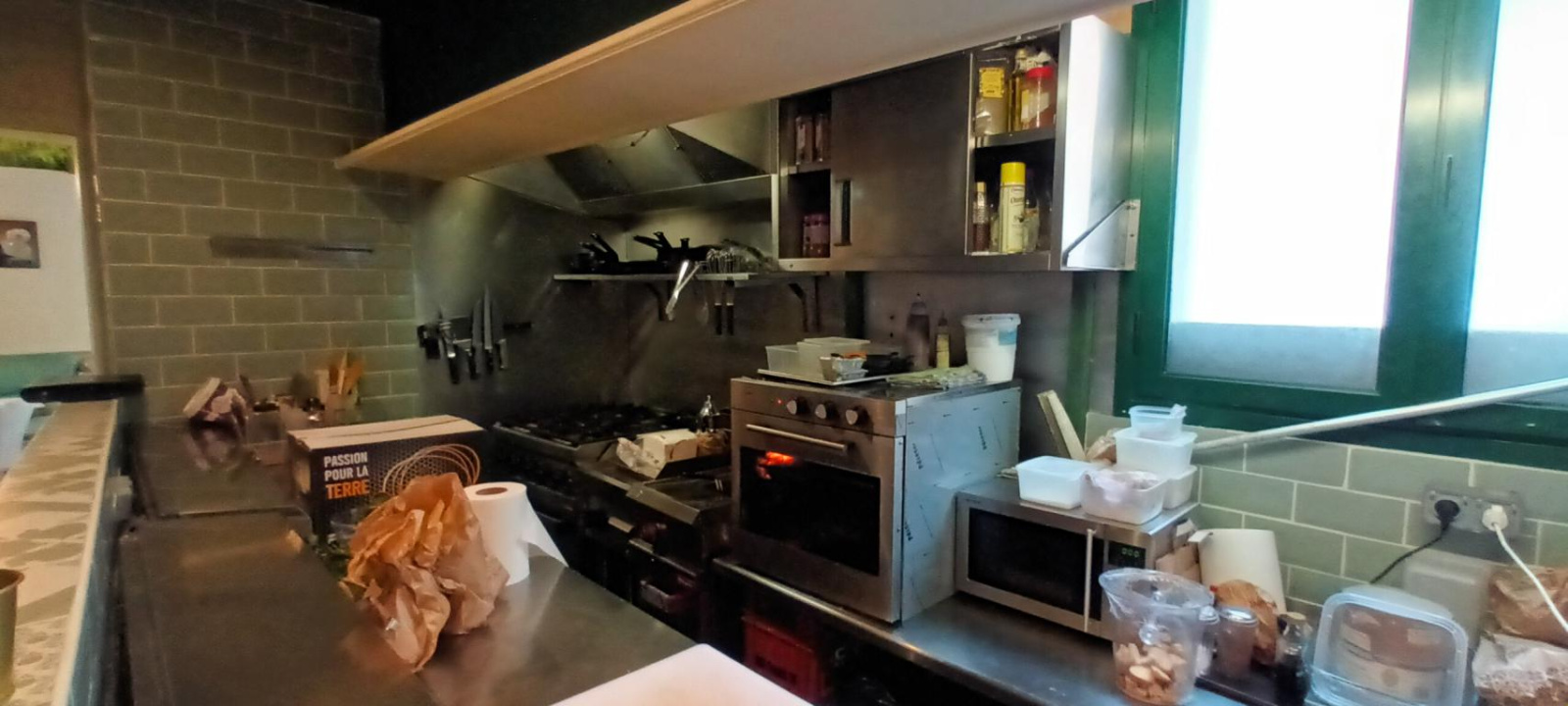 Une cuisine professionnelle ouverte, complétement équipée, piano à gaz de ville, hotte dans les normes, étagères en inox, four, plancha, friteuse et meuble réfrigéré.
