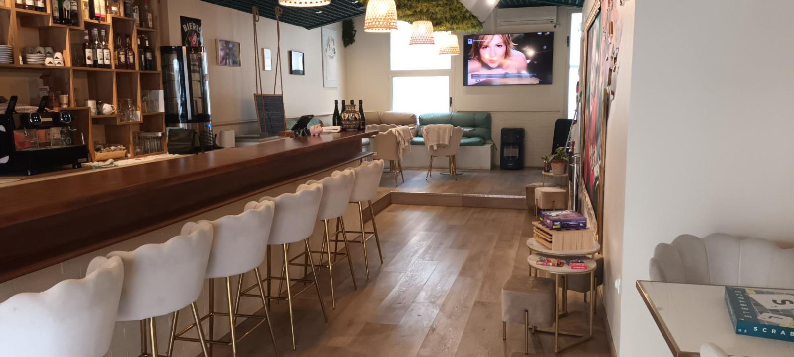 Une première salle, avec un grand bar entièrement équipé, meublé de chaises hautes, fauteuils, tables basses, décoration raffinée.