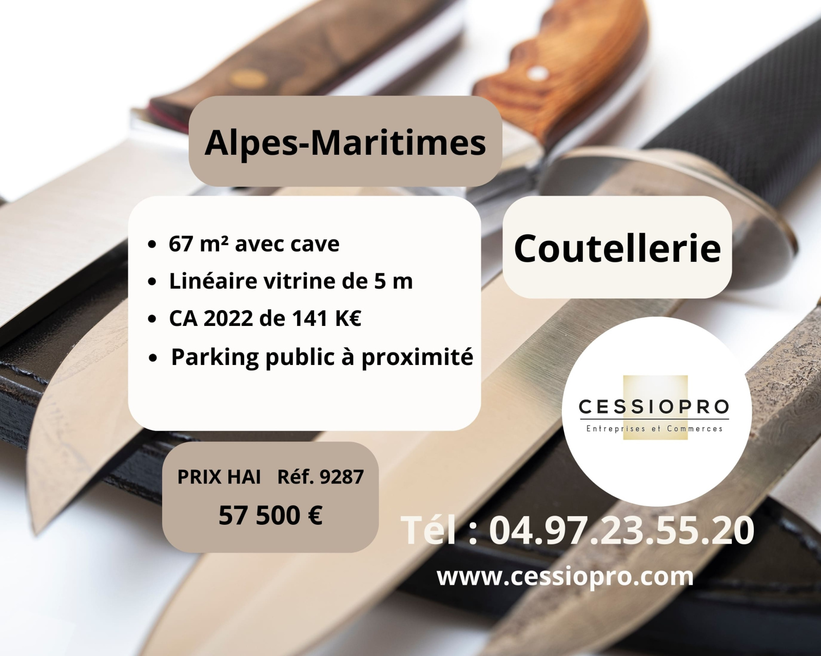 FONDS DE COMMERCE DE COUTELLERIE ALPES MARITIMES : A vendre un fonds de commerce de coutellerie crée il y a 10 ans . Cette entreprise commercialise tous types de couteaux, ciseaux, parapluies et cannes . Une activité d’affûtage à destination des professionnels ( cuisiniers , salon de coiffures , salon de toilettage ) et de particuliers . La vente sur internet est à développer . Le stock est non compris dans le prix de vente indiqué . Le chiffre d’affaires est stable : 141 000 € avec un EBE retraité de 38 000 € . La boutique de 63 m² comprenant une pièce dédié à l’affûtage , caméra et alarme . Un loyer raisonnable pour le secteur de 1028 € mensuel . Facilité de stationnement avec un parking public à proximité . Idéal pour une reconversion avec un accompagnement du vendeur . Prix 57500 € honoraire inclus. Honoraires de 7500 € TTC à la charge de l’acquéreur.