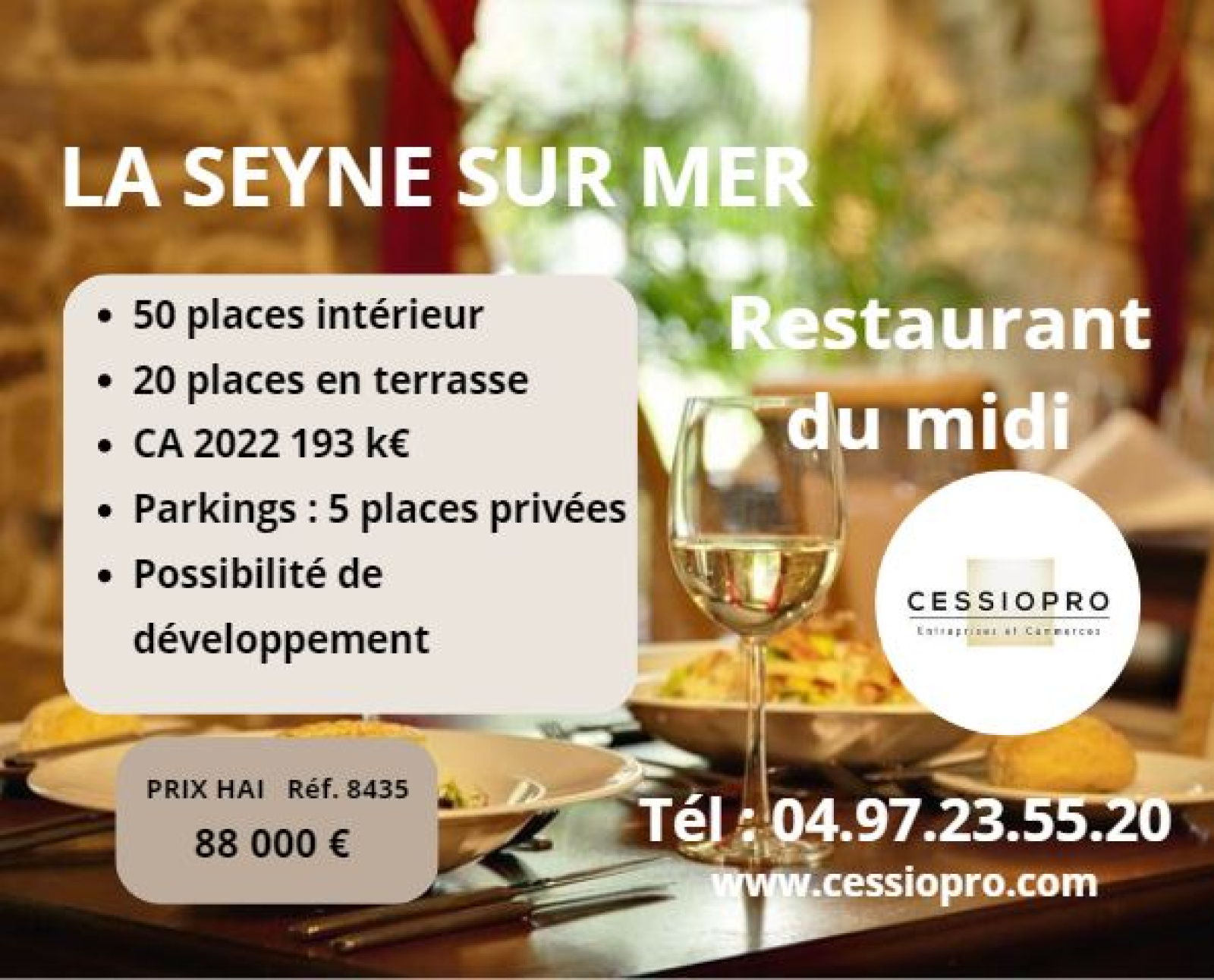COTE SALLE : Vous disposez de 50 couverts en salle et une vingtaine en terrasse (pas de droits de voierie !). Il est possible d’augmenter la capacité avec un agencement différent.