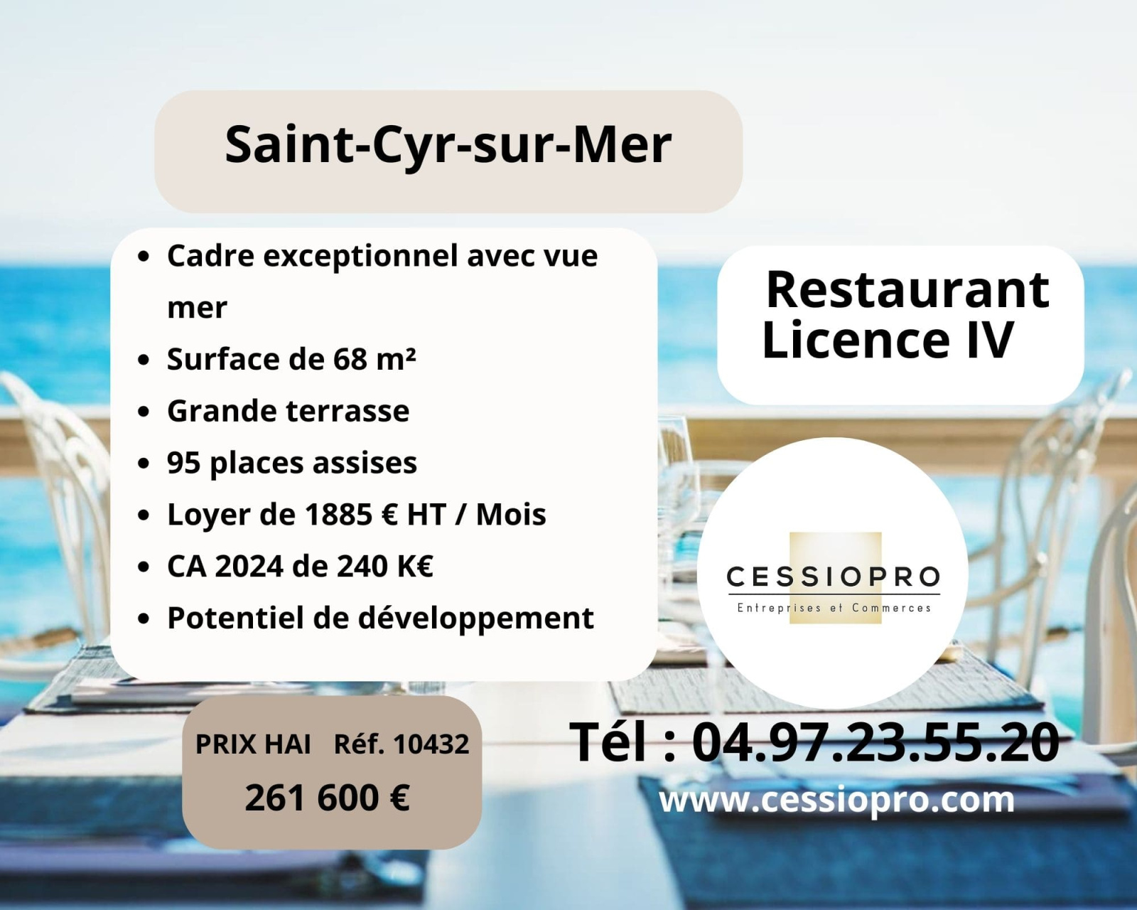 RESTAURANT VUE MER AVEC LICENCE IV, EMPLACEMENT PREMIUM, CA 256 KE AVEC FORT POTENTIEL,